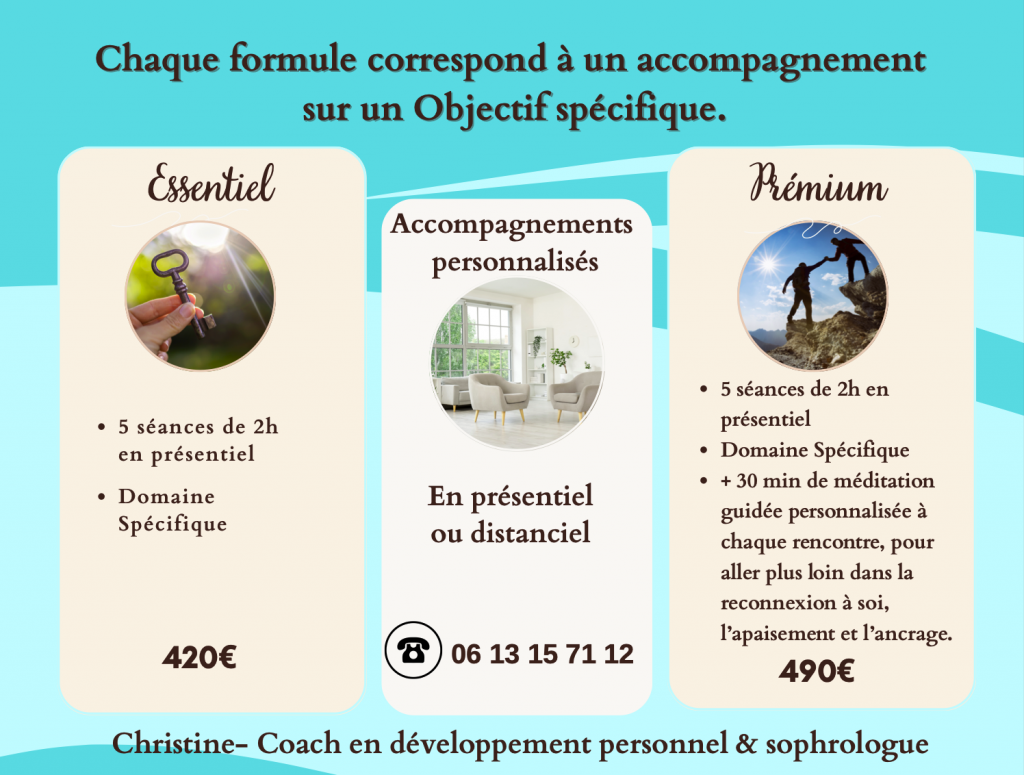 Avec un accompagnement personnalisé, vous serez en mesure de déterminer vos forces, faiblesses et objectifs, et de mettre en place un plan d’action pour les atteindre. Et en adoptant de nouvelles habitudes, stratégies et manières d’être, qui vous premettront de combler vos besoins et d’atteindre vos objectifs.
